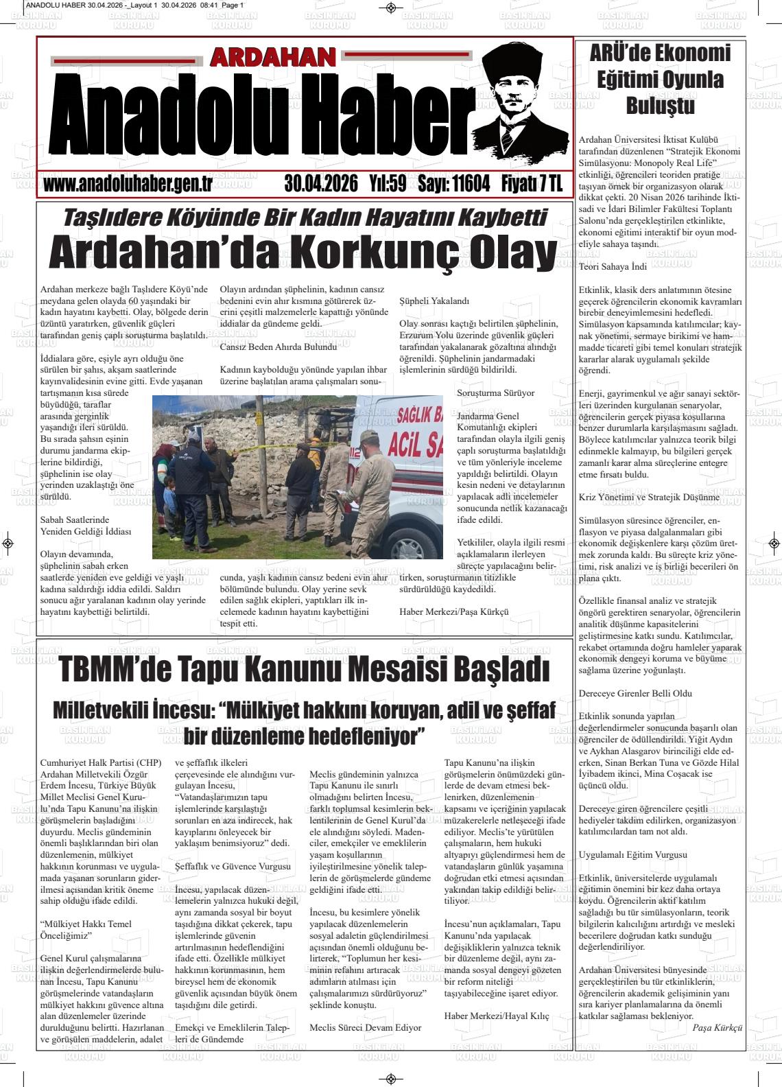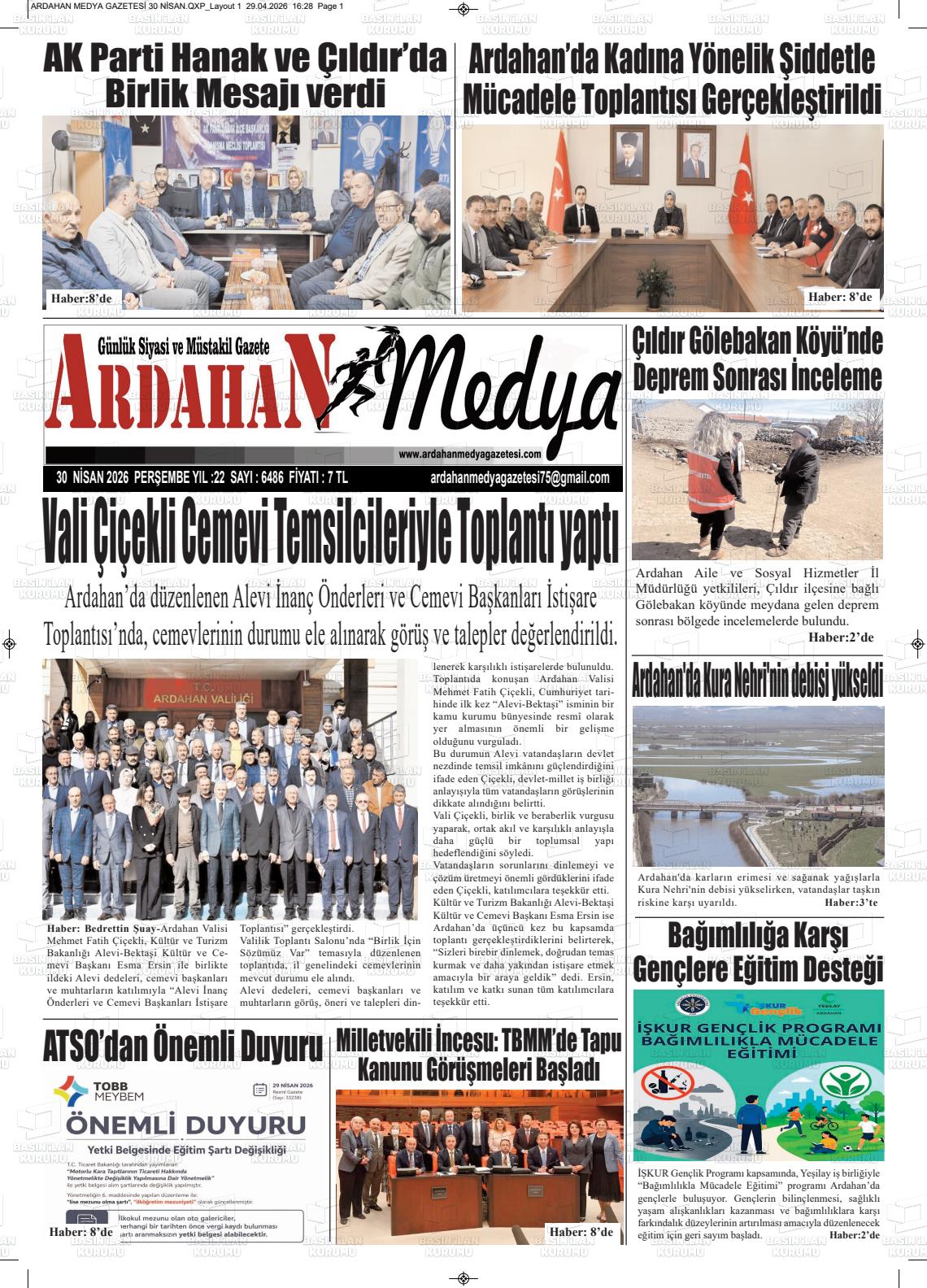 Ardahan Yerel Gazeteleri 30 Nisan 2026, Perşembe Günü Manşeti