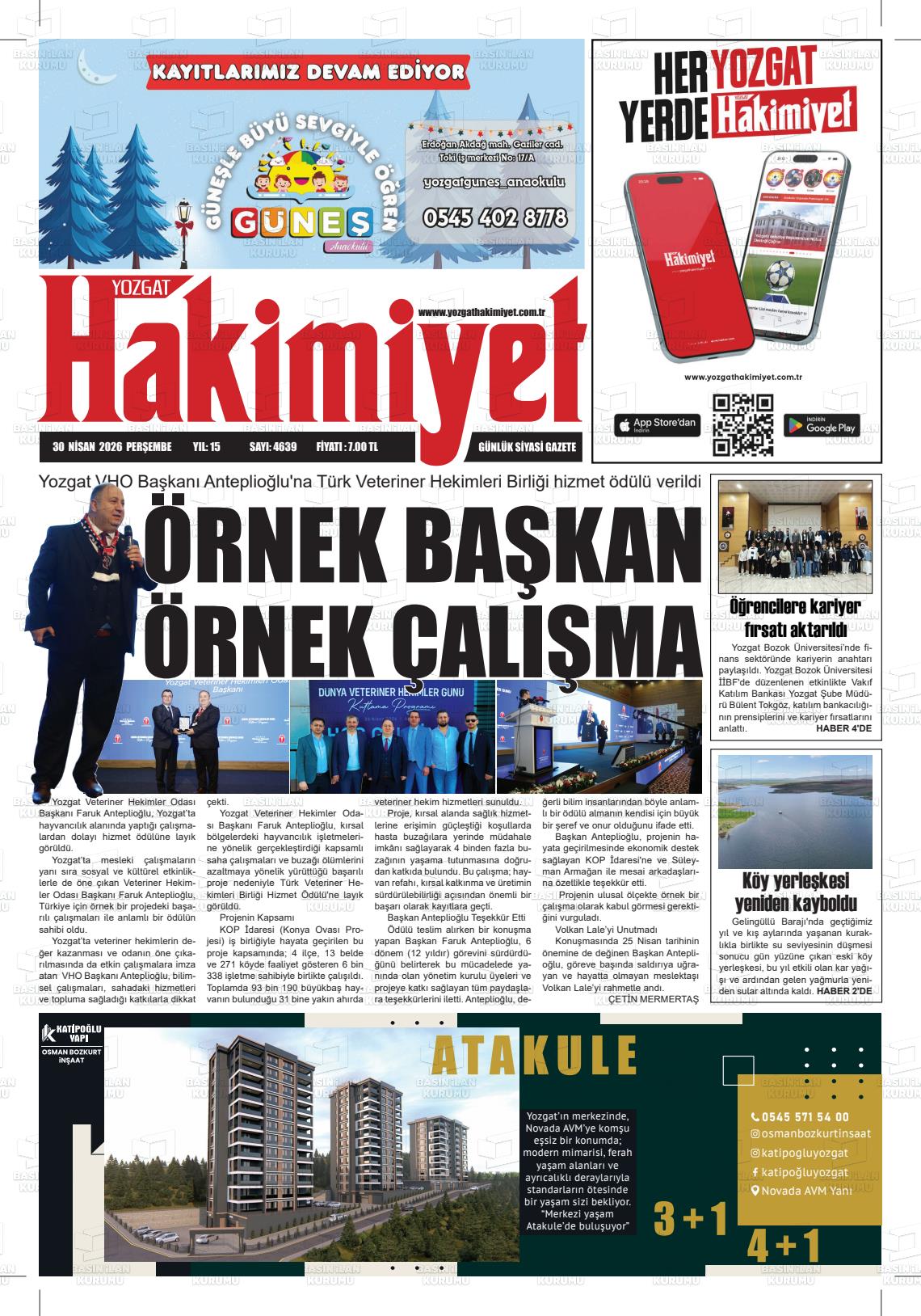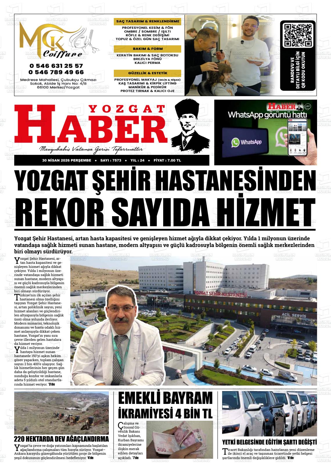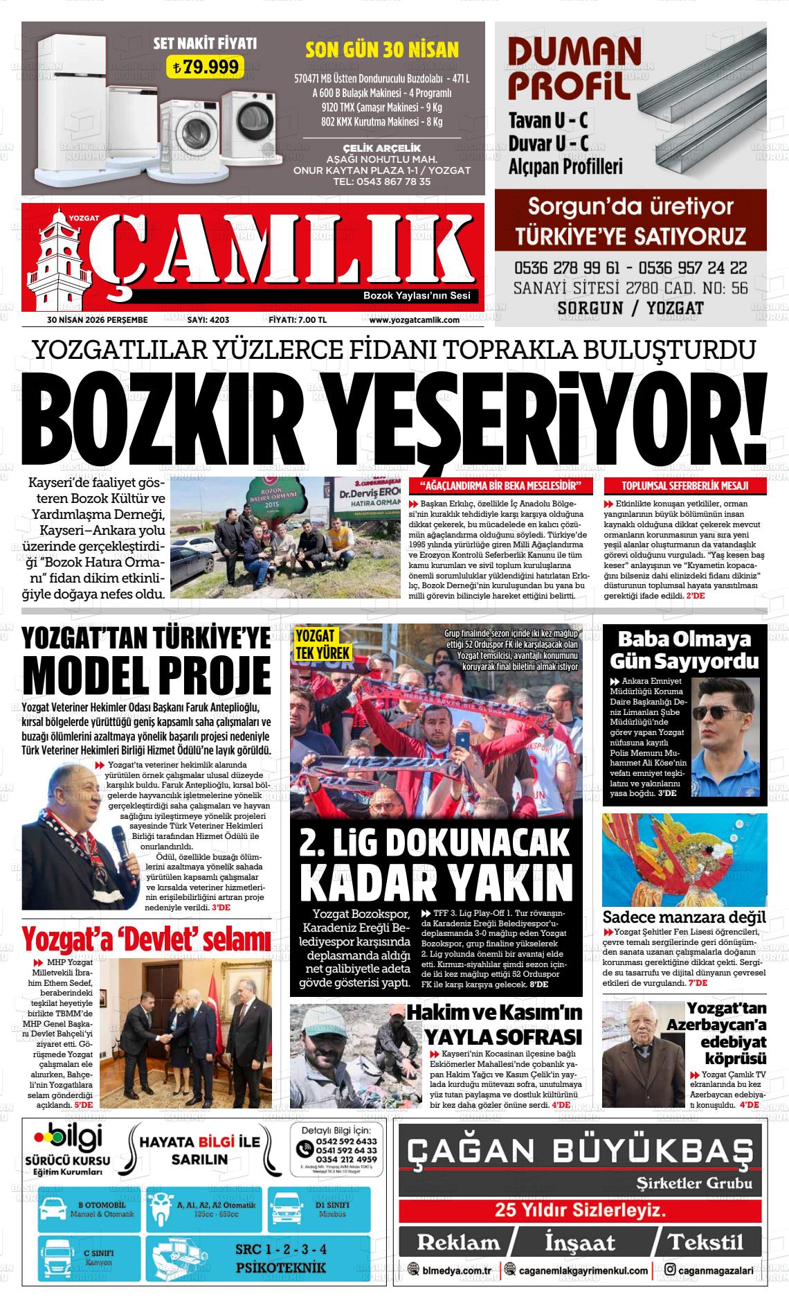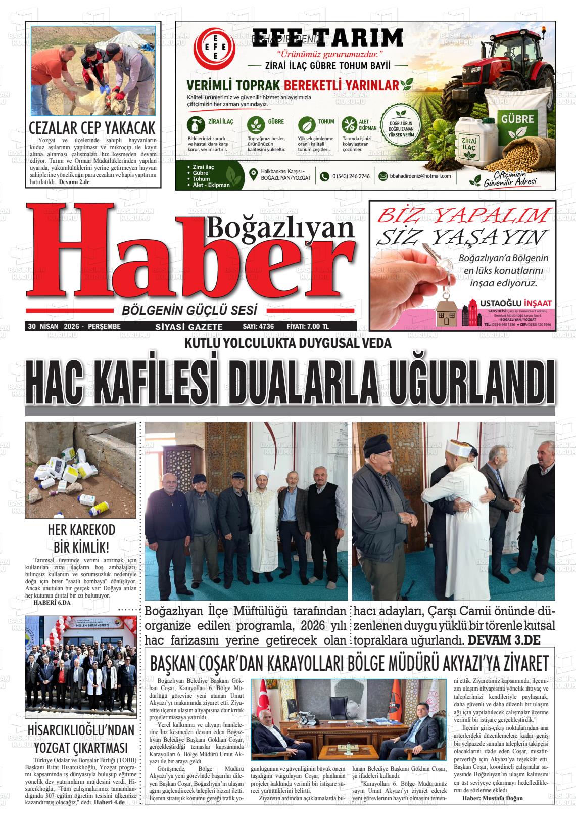 Yozgat Yerel Gazeteleri 30 Nisan 2026, Perşembe Günü Manşeti
